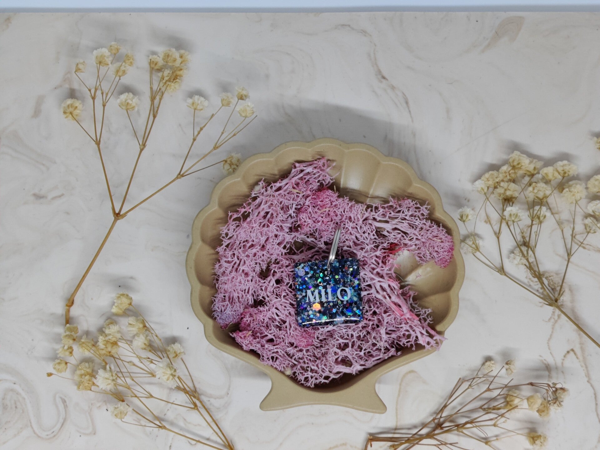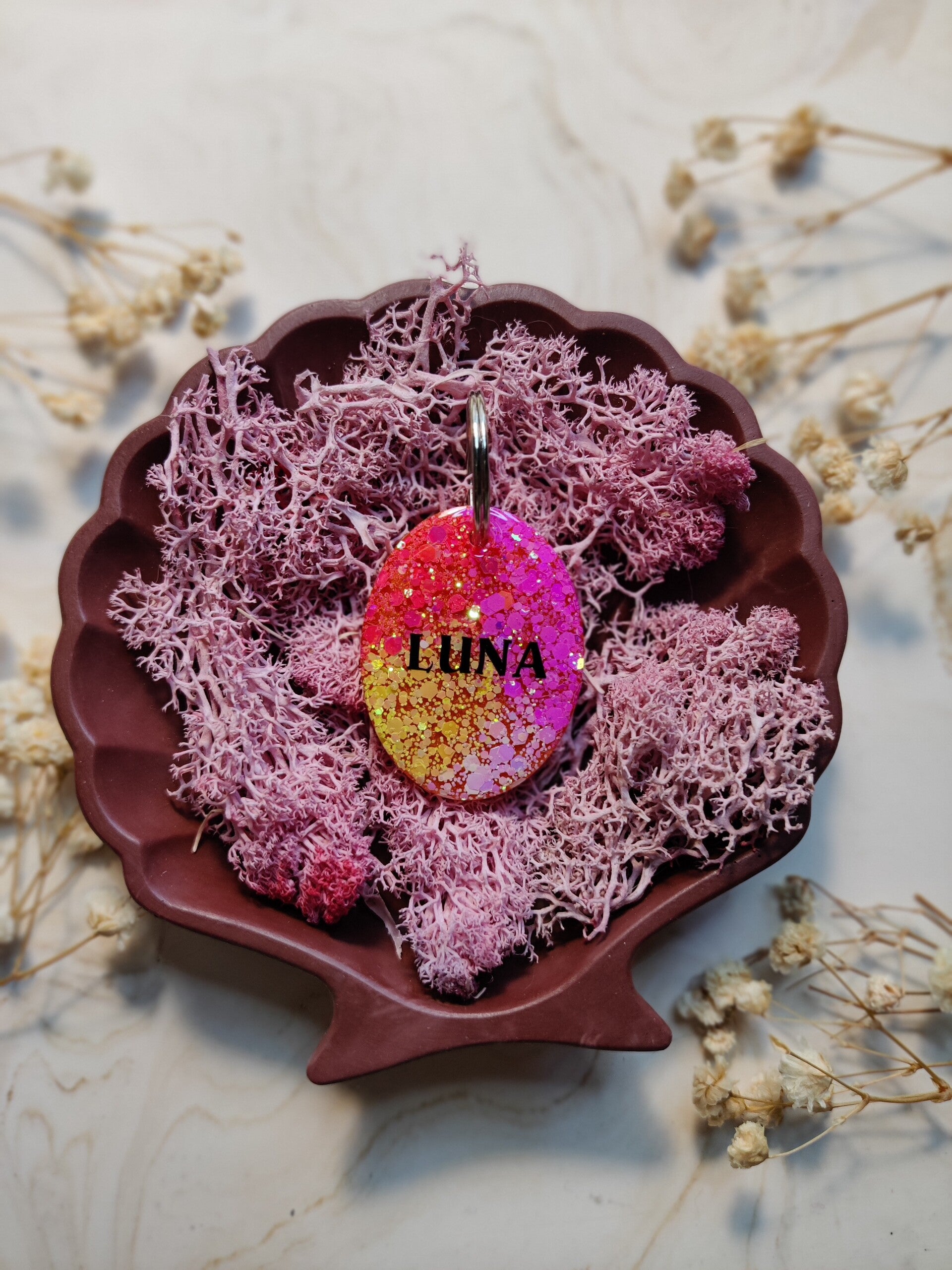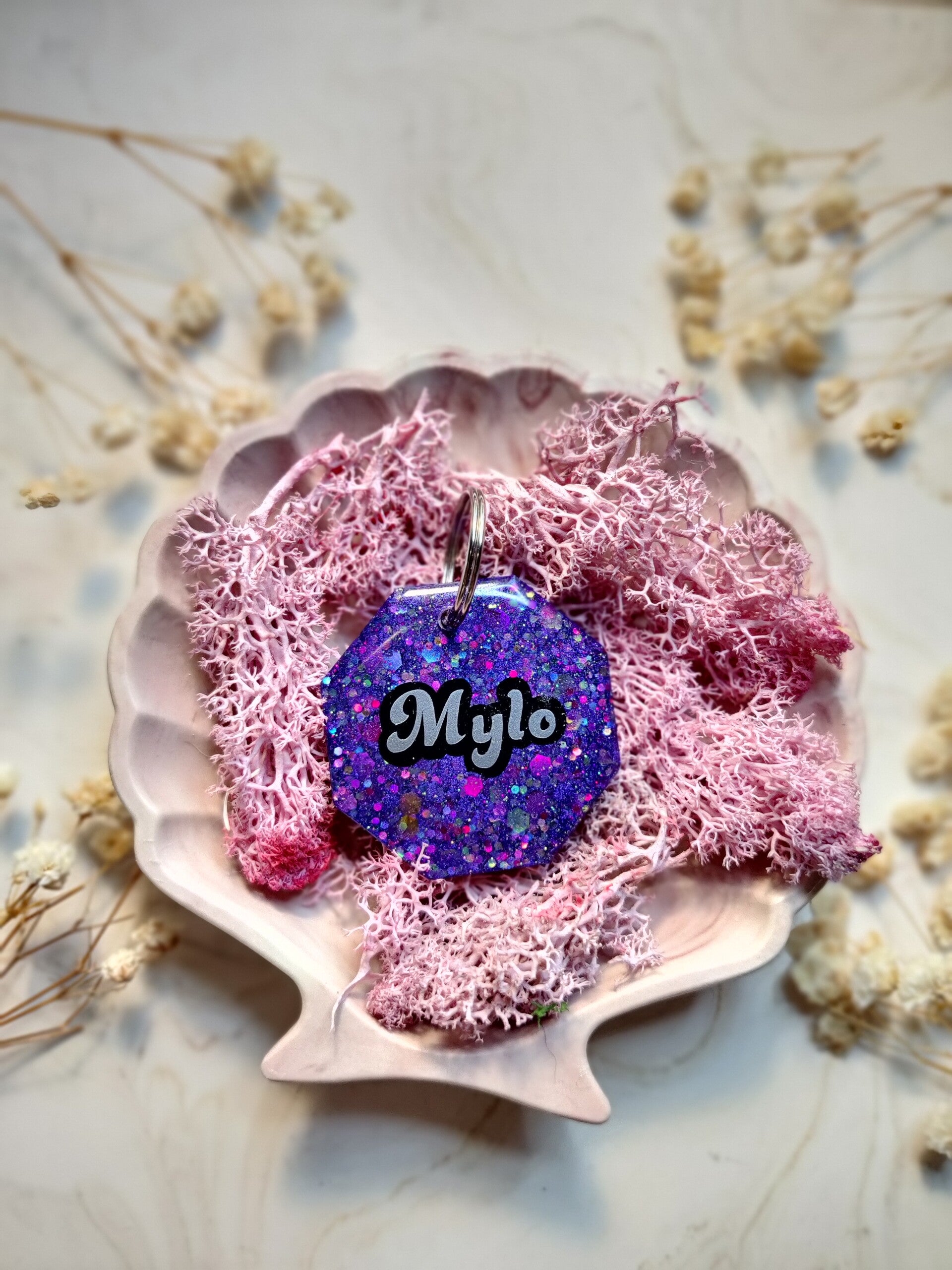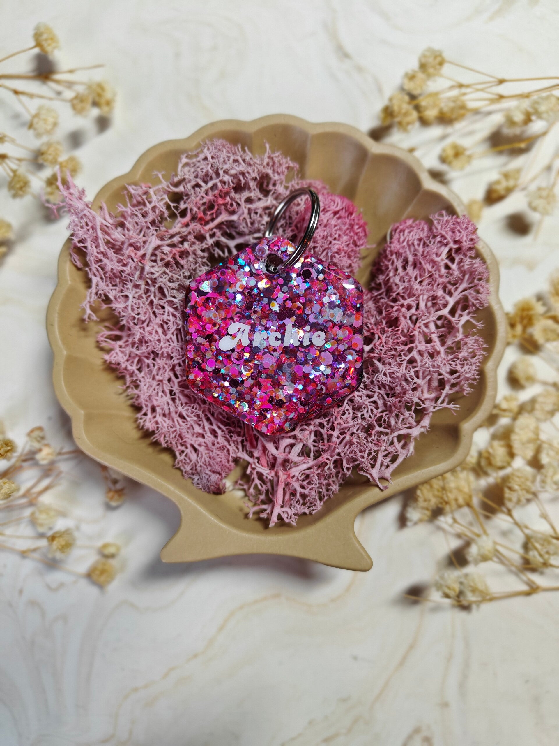 With the Personalised Glitter tag you choose your glitter colour, shape, name, flakes, letter colour, the style of the name and if you want shadow added or not. The flakes are optional. Phone number can be added on the back.