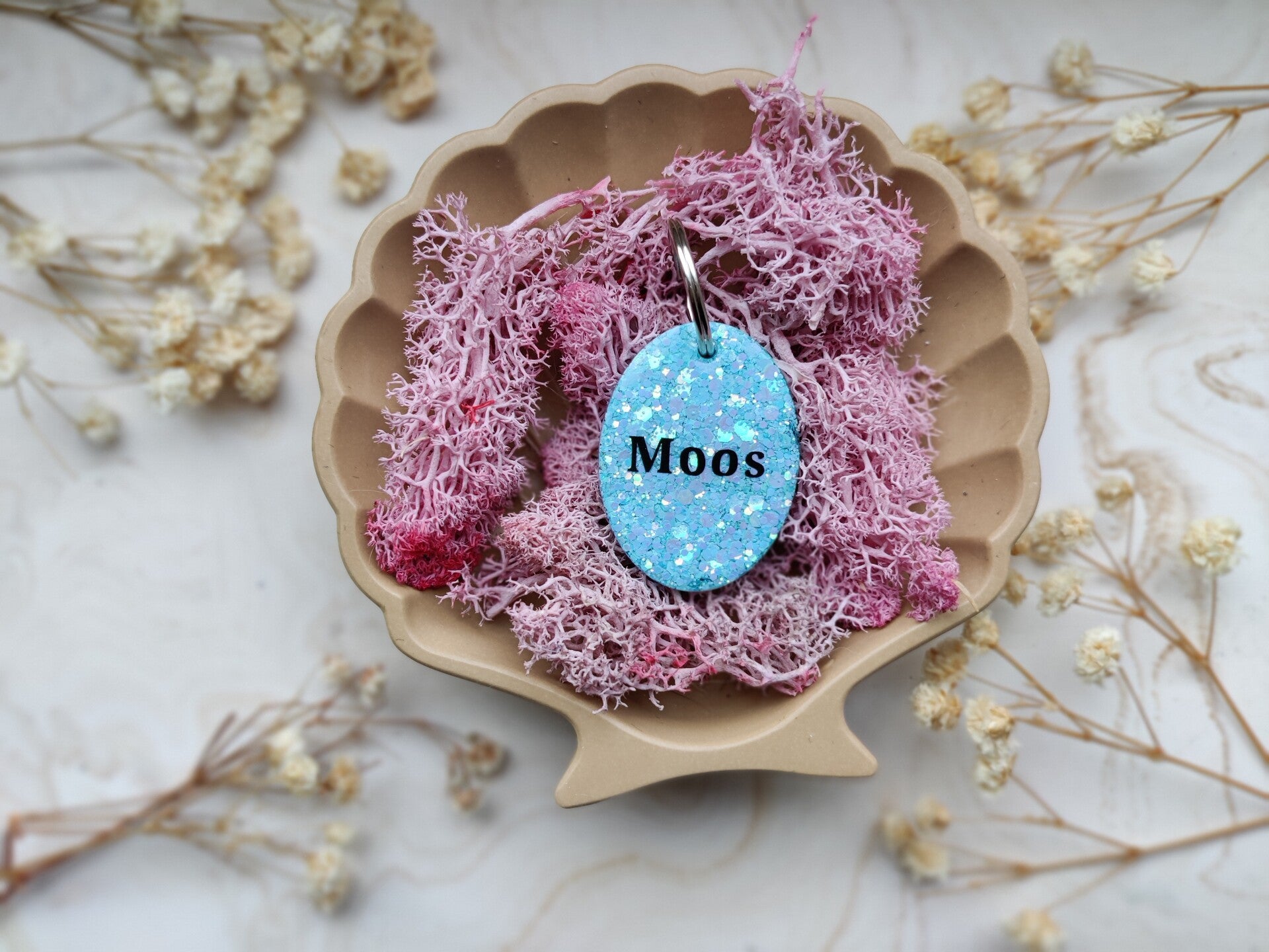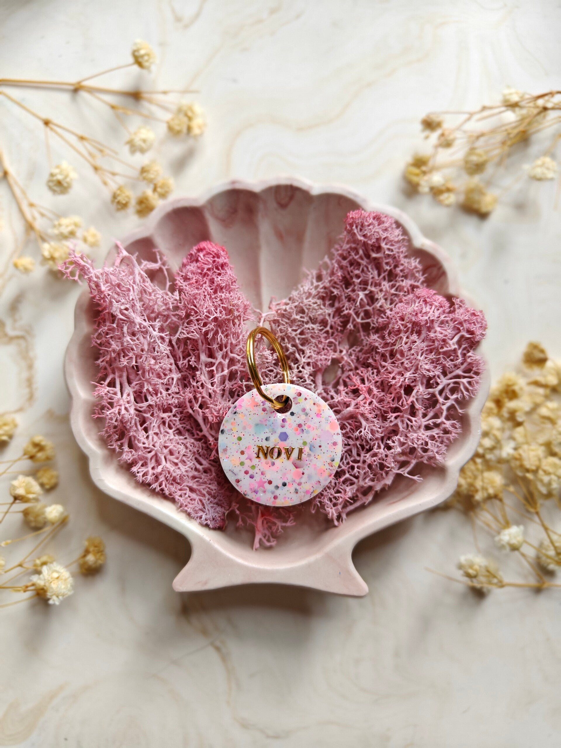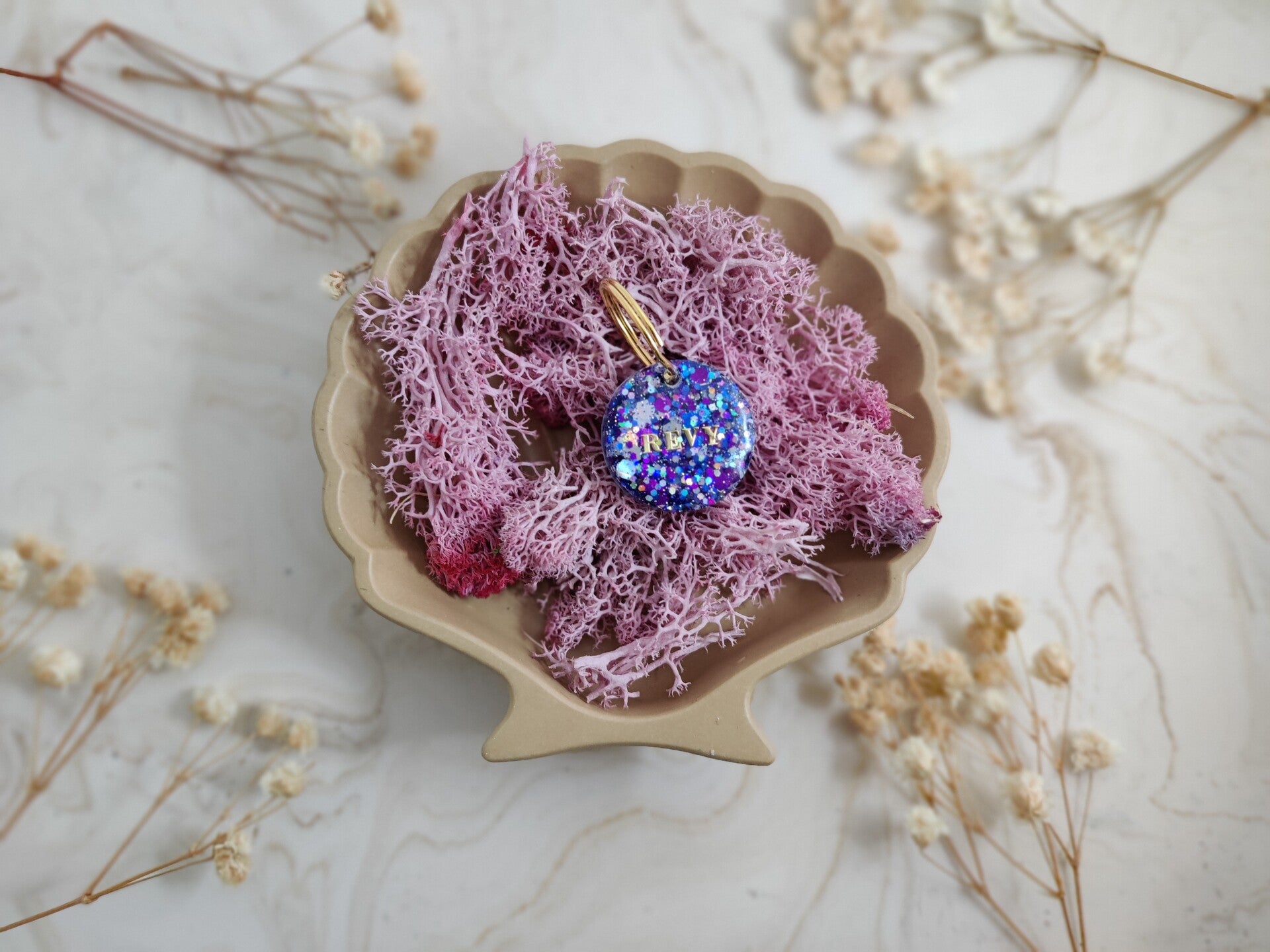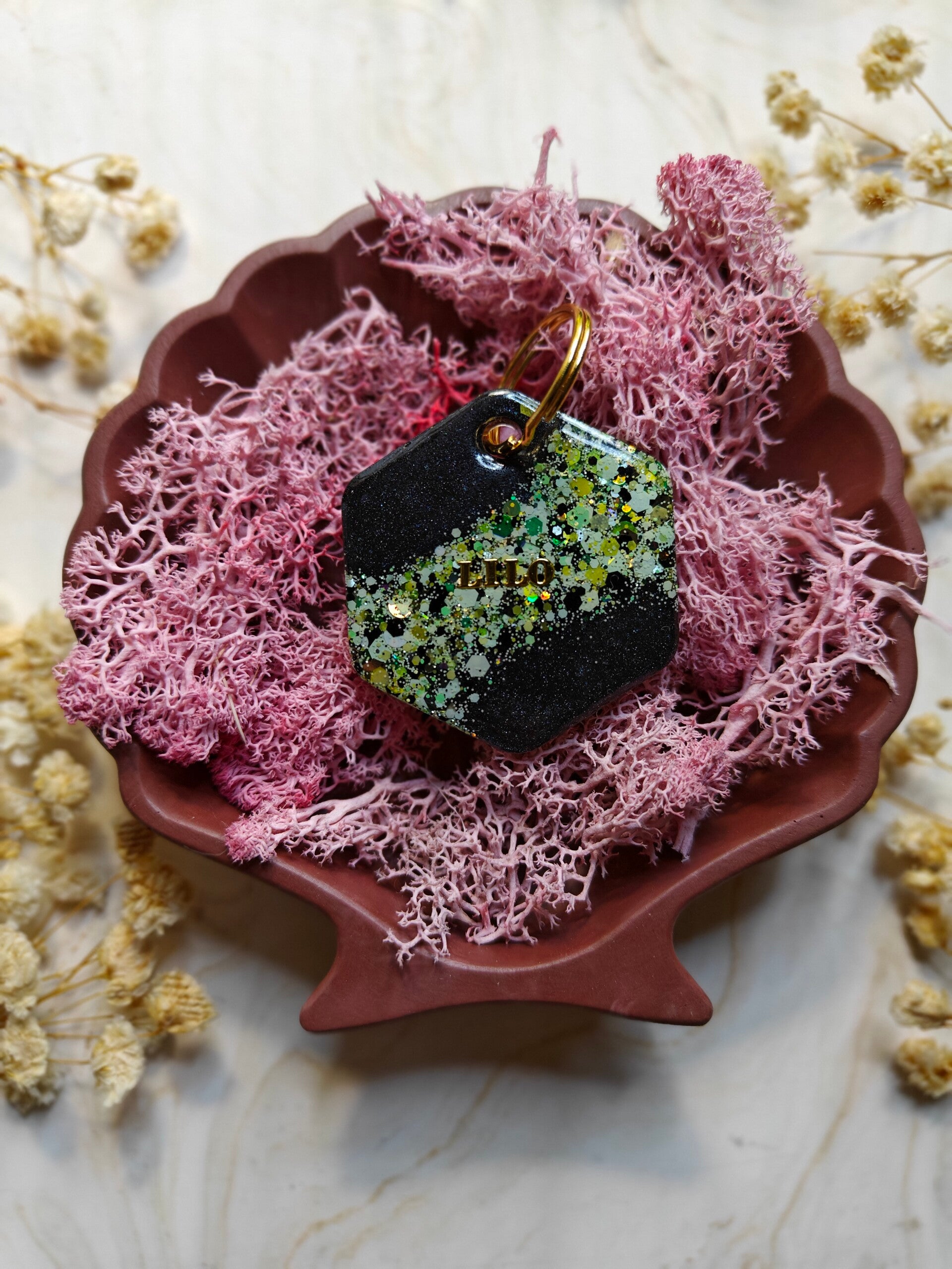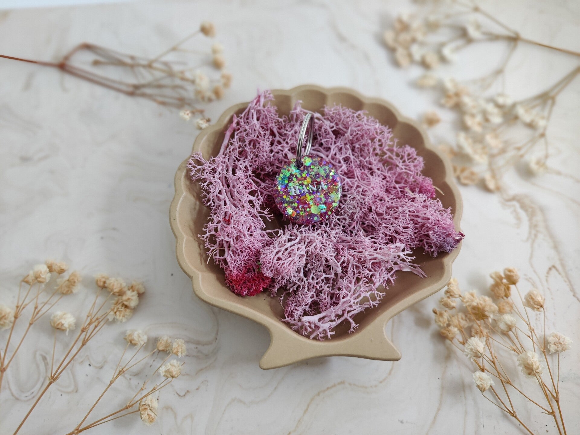 With the Personalised Glitter tag you choose your glitter colour, shape, name, flakes, letter colour, the style of the name and if you want shadow added or not. The flakes are optional. Phone number can be added on the back.