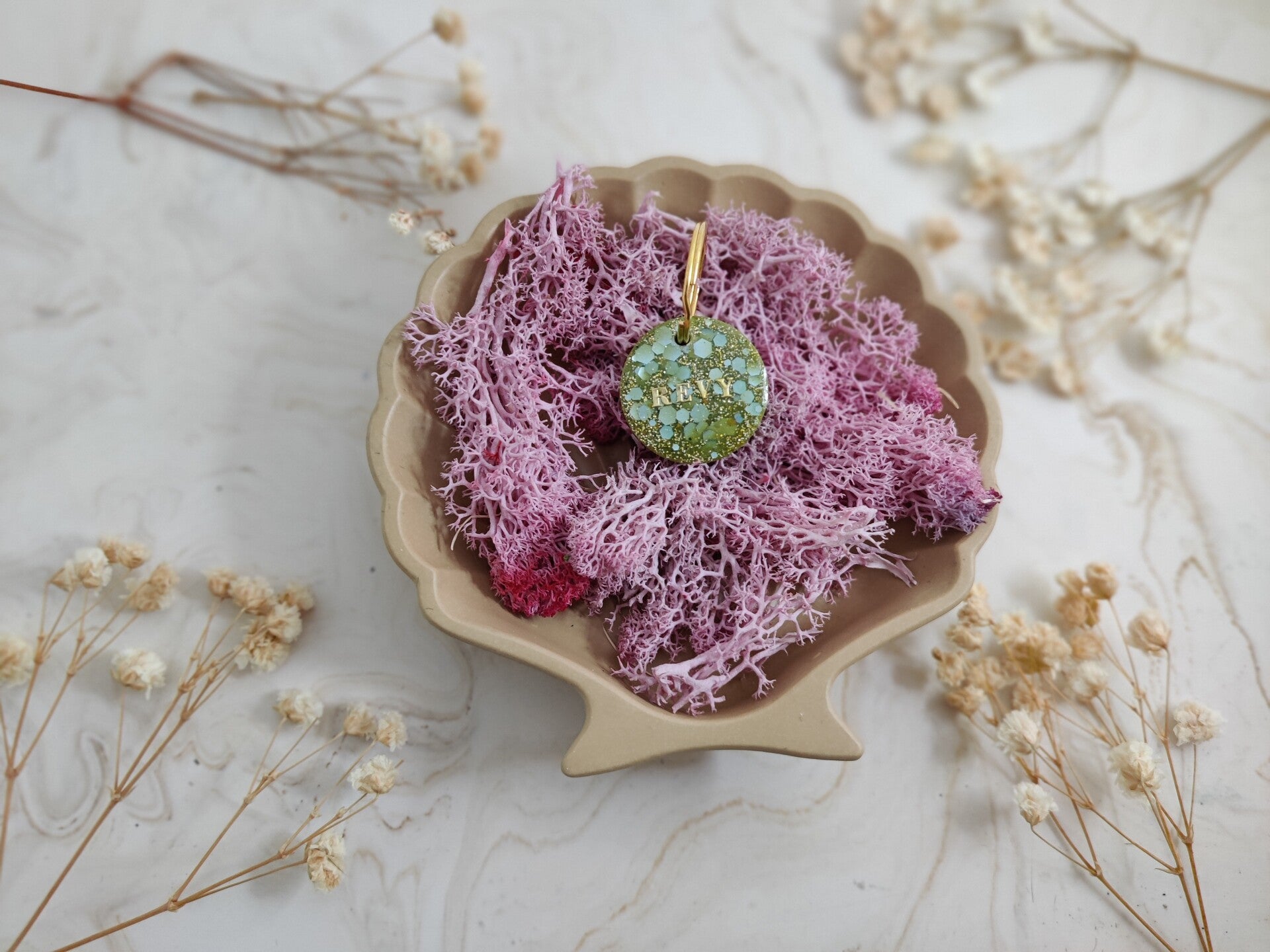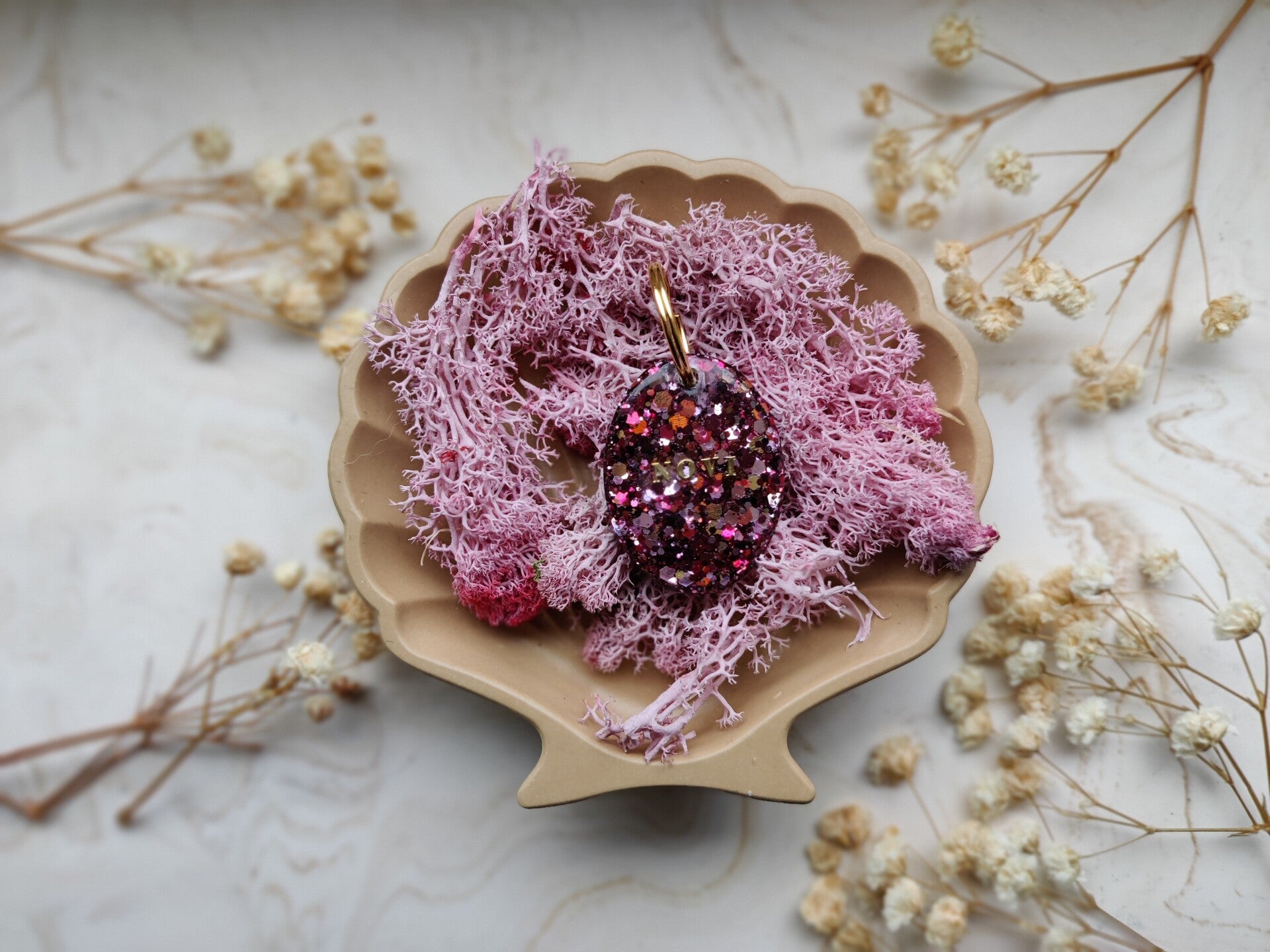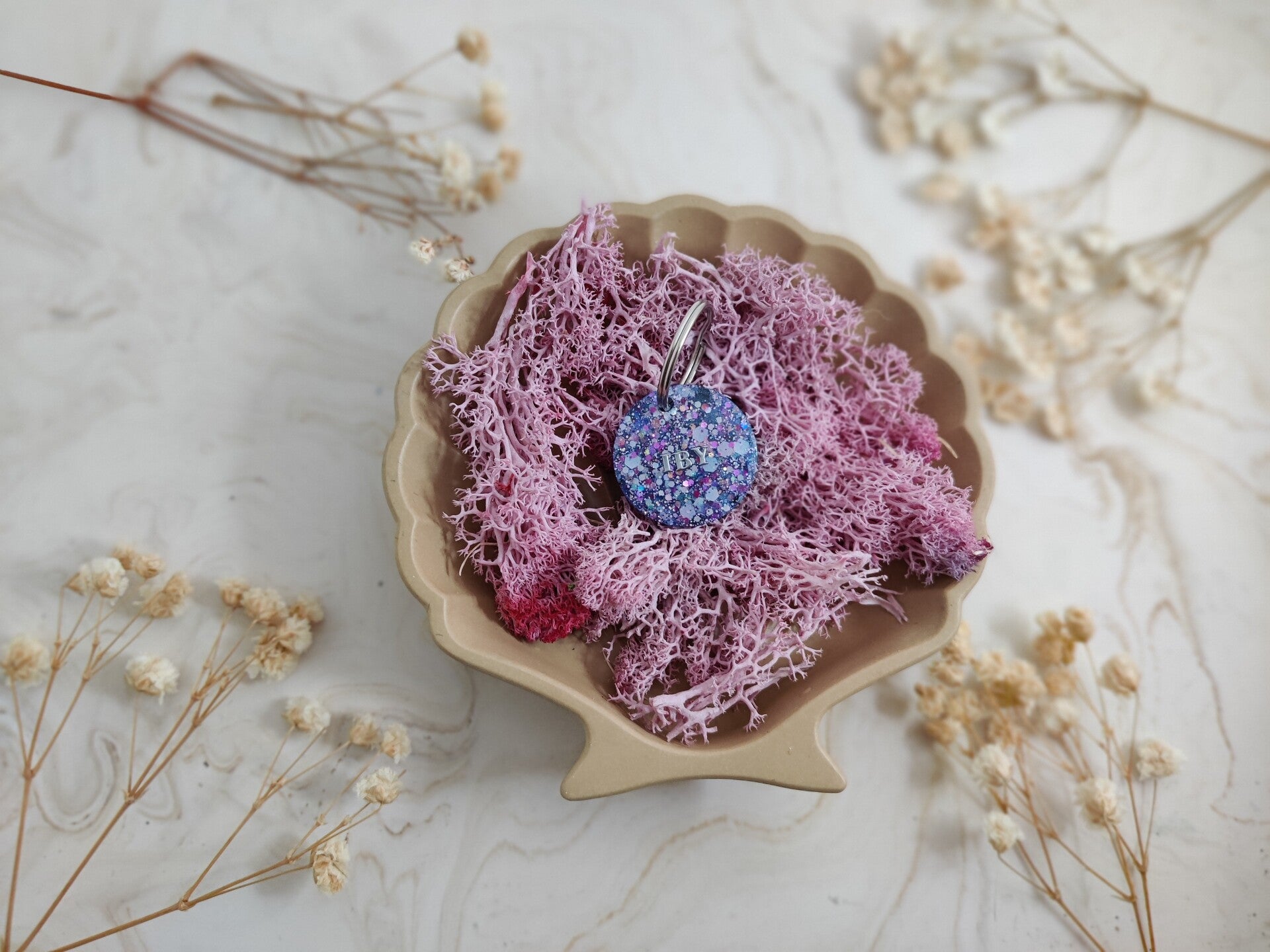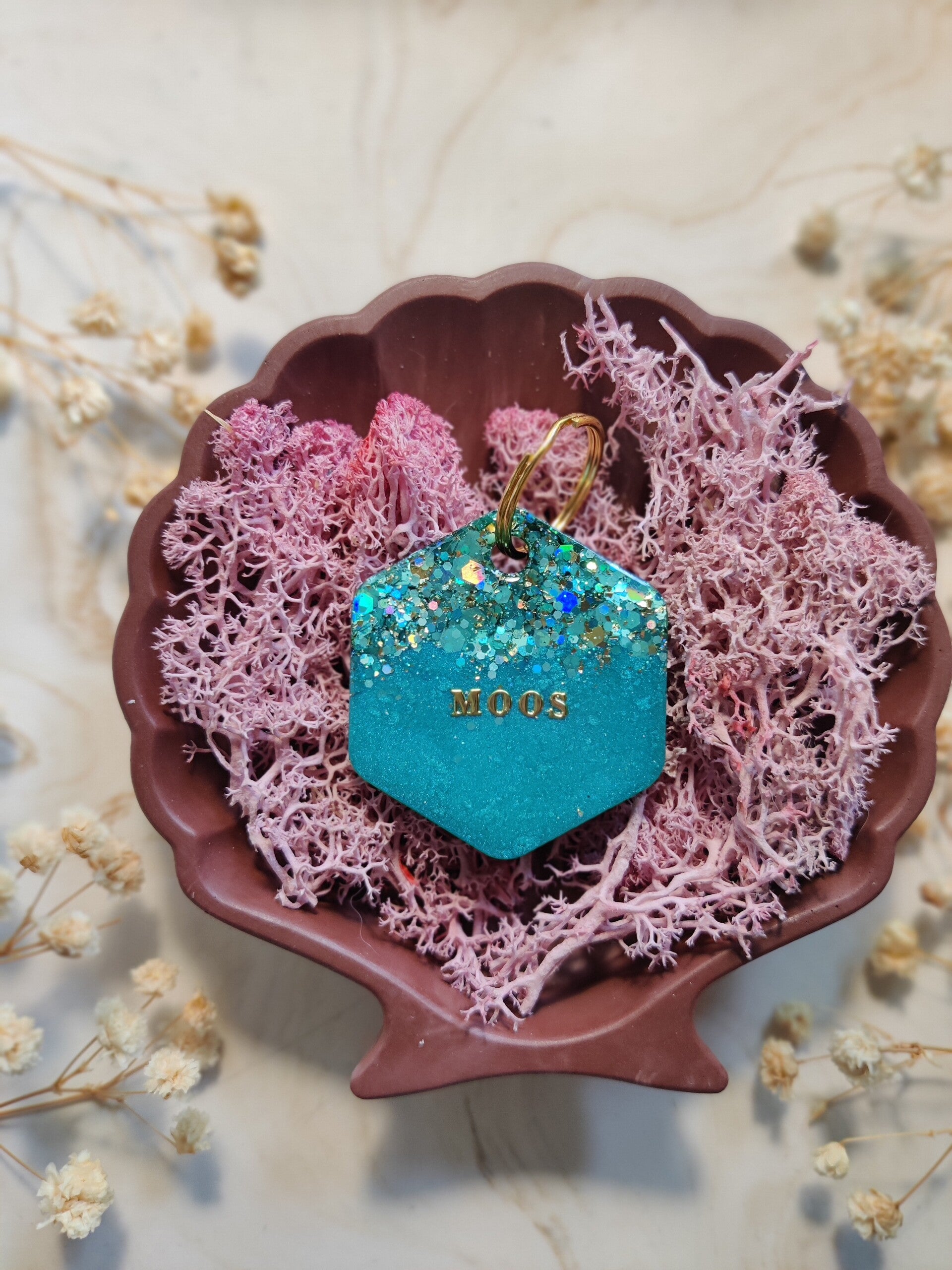 With the Personalised Glitter tag you choose your glitter colour, shape, name, flakes, letter colour, the style of the name and if you want shadow added or not. The flakes are optional. Phone number can be added on the back.