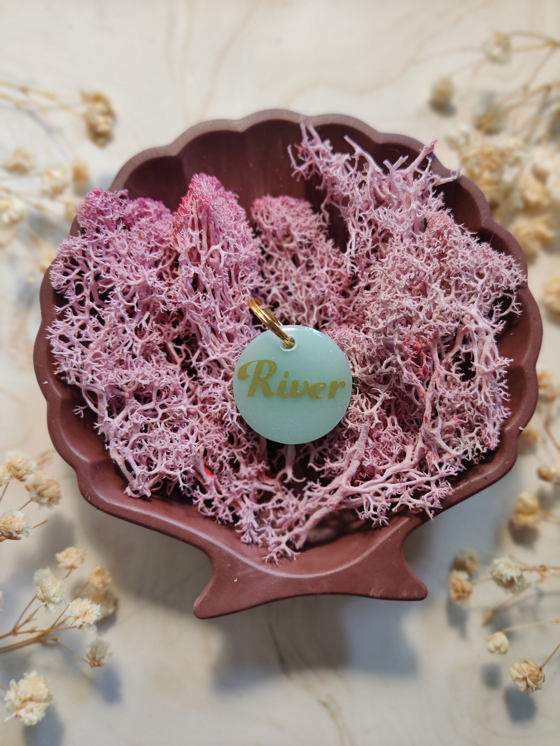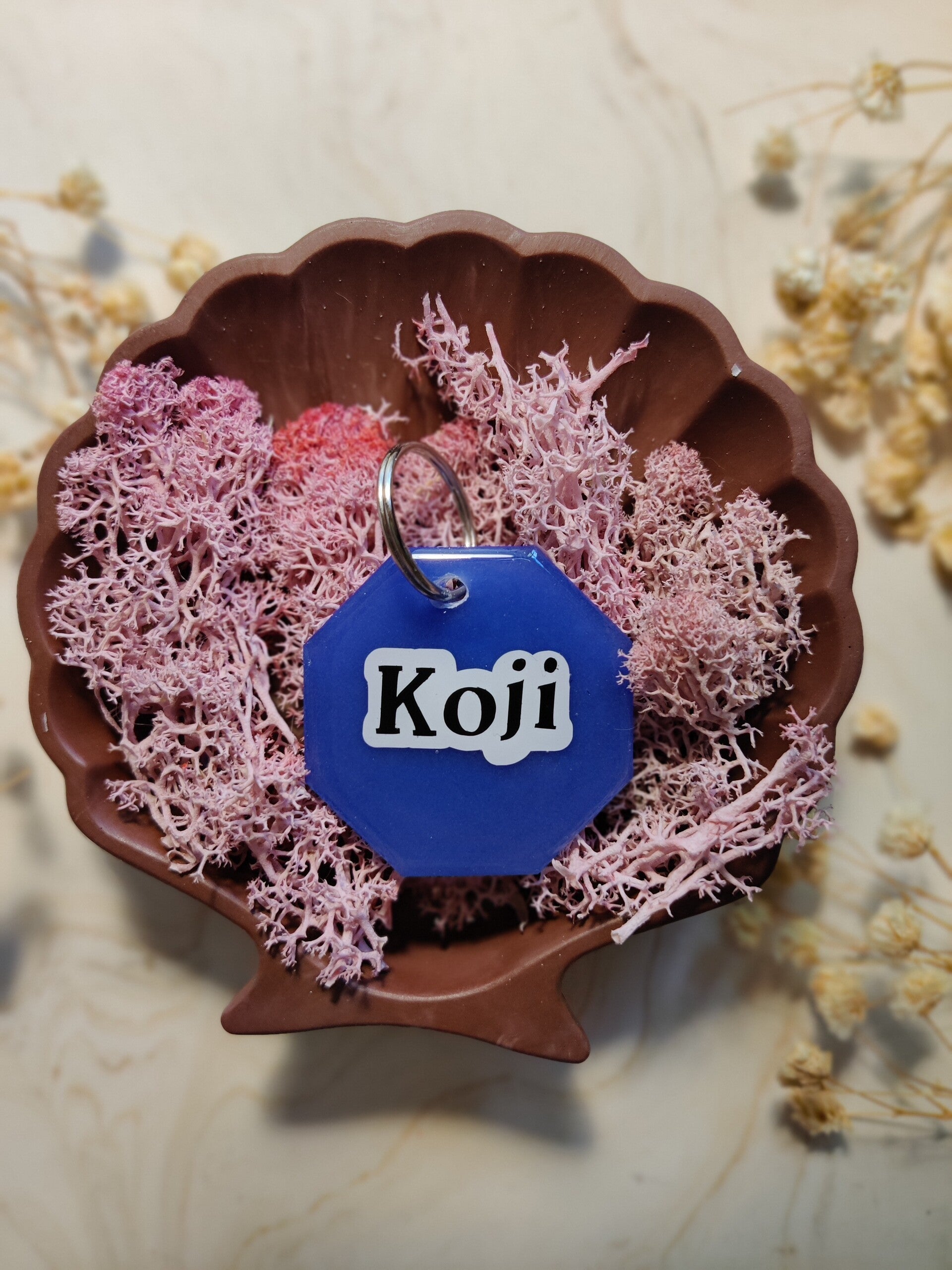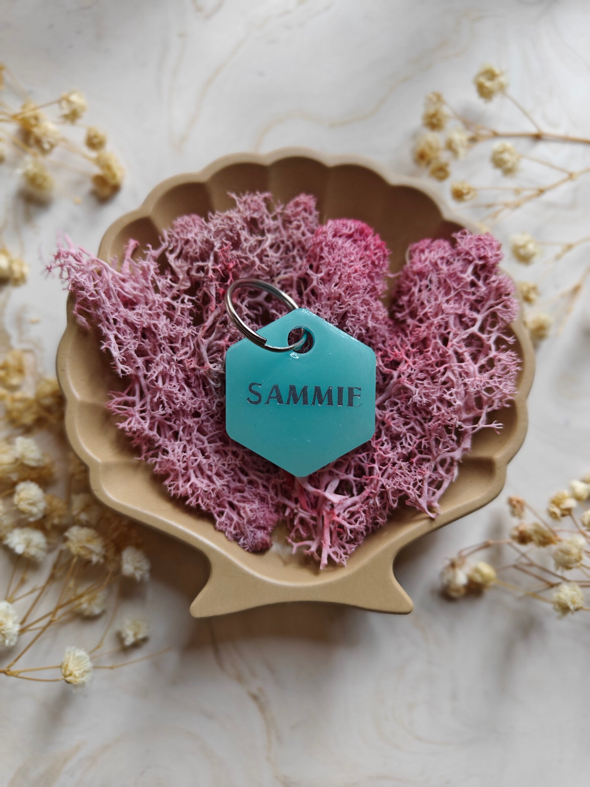 With the Neon tag you choose your colour, shape, name, flakes, letter colour, the style of the name and if you want shadow added or not. The flakes are optional. PPhone number can be added on the back. The tag has a neon colour with a matching basic colour so that you don't see the phone number. Unless stated that you do not want a phone number on the back or basic colour on the back.