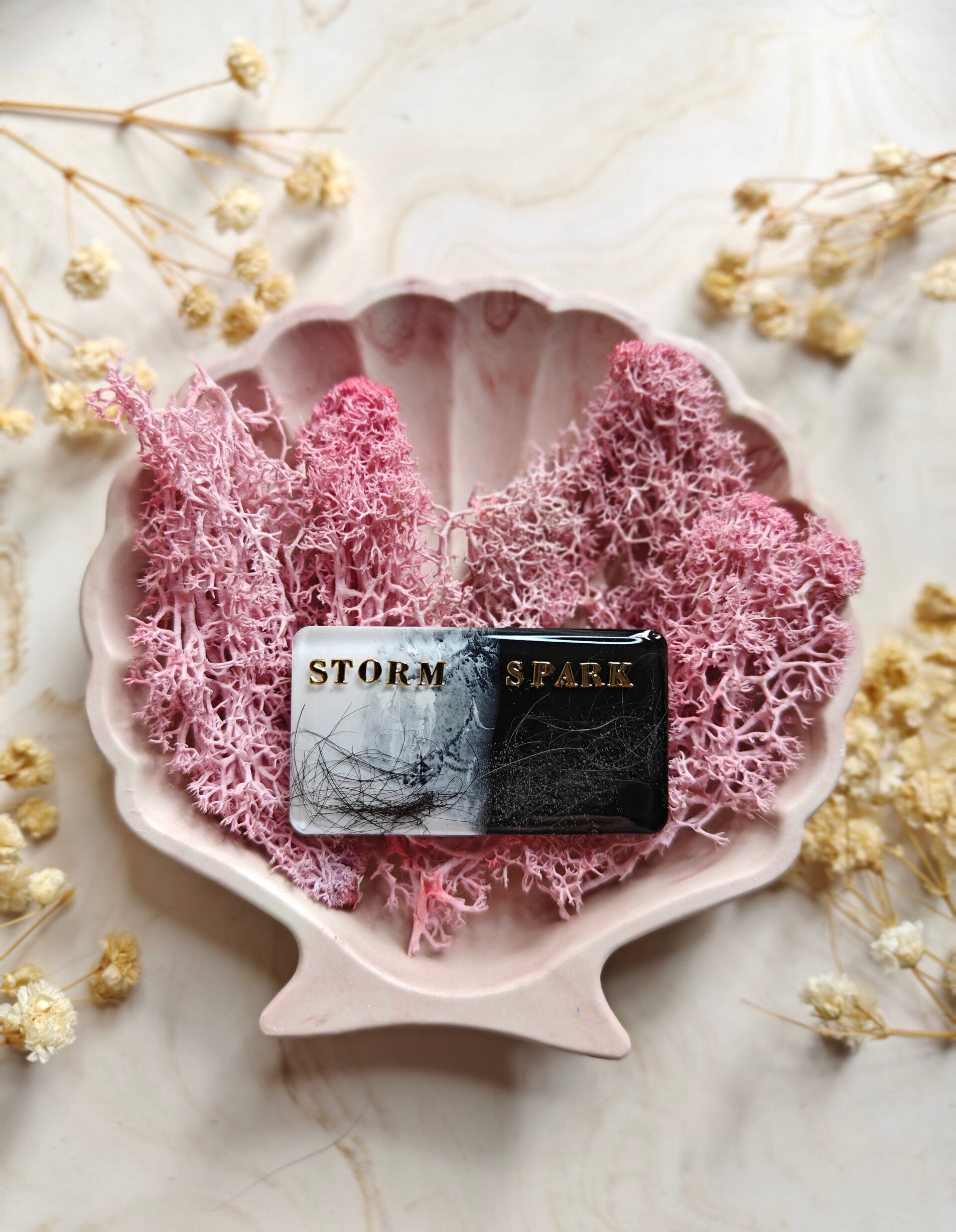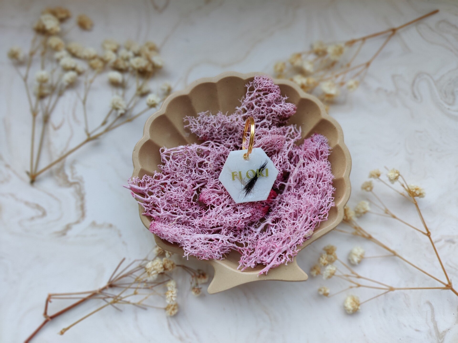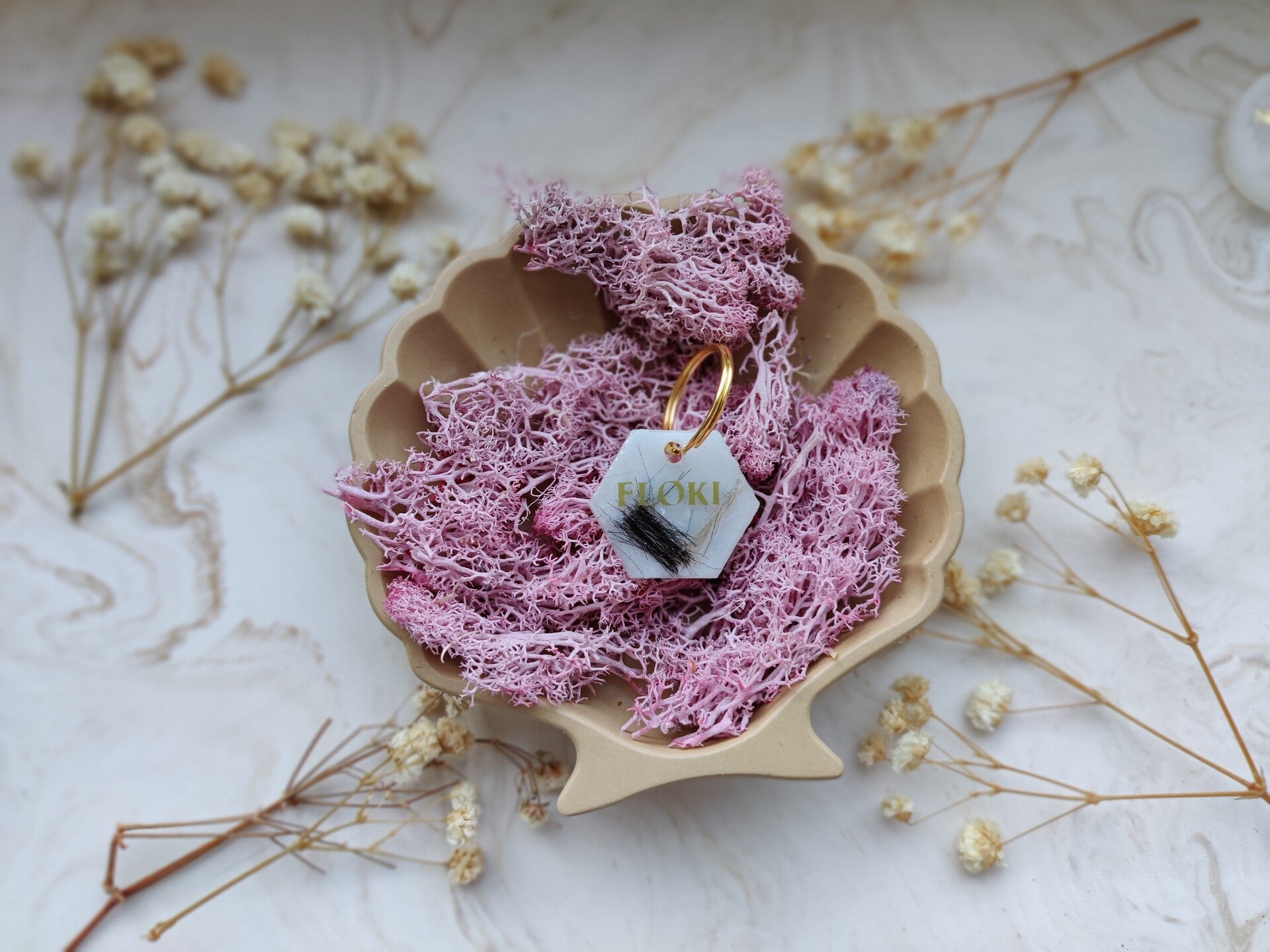 With the Bo's memories tag you choose your colour, shape, pattern, name, flakes, letter colour, the style of the name and if you want shadow added or not. The flakes are optional.