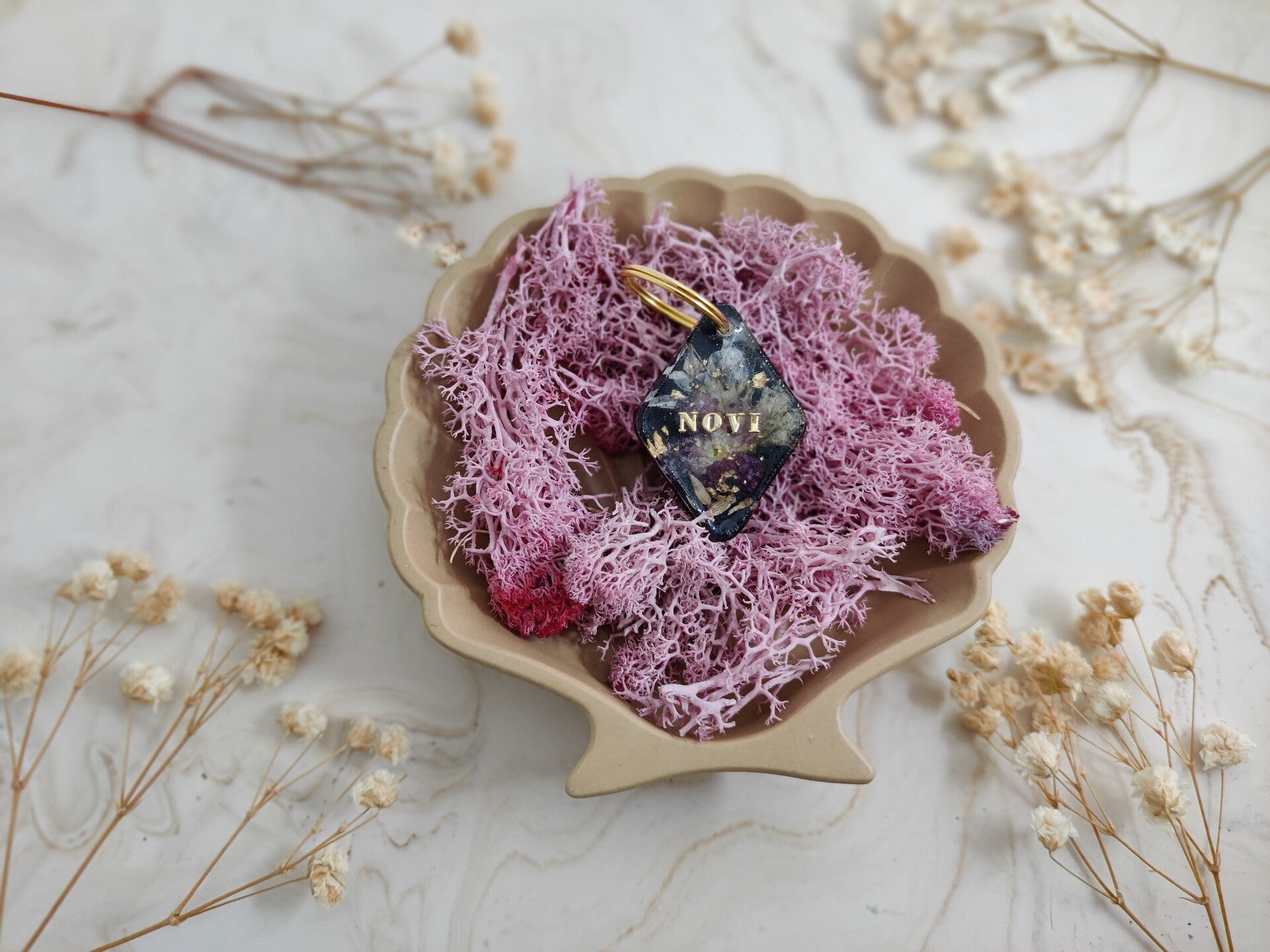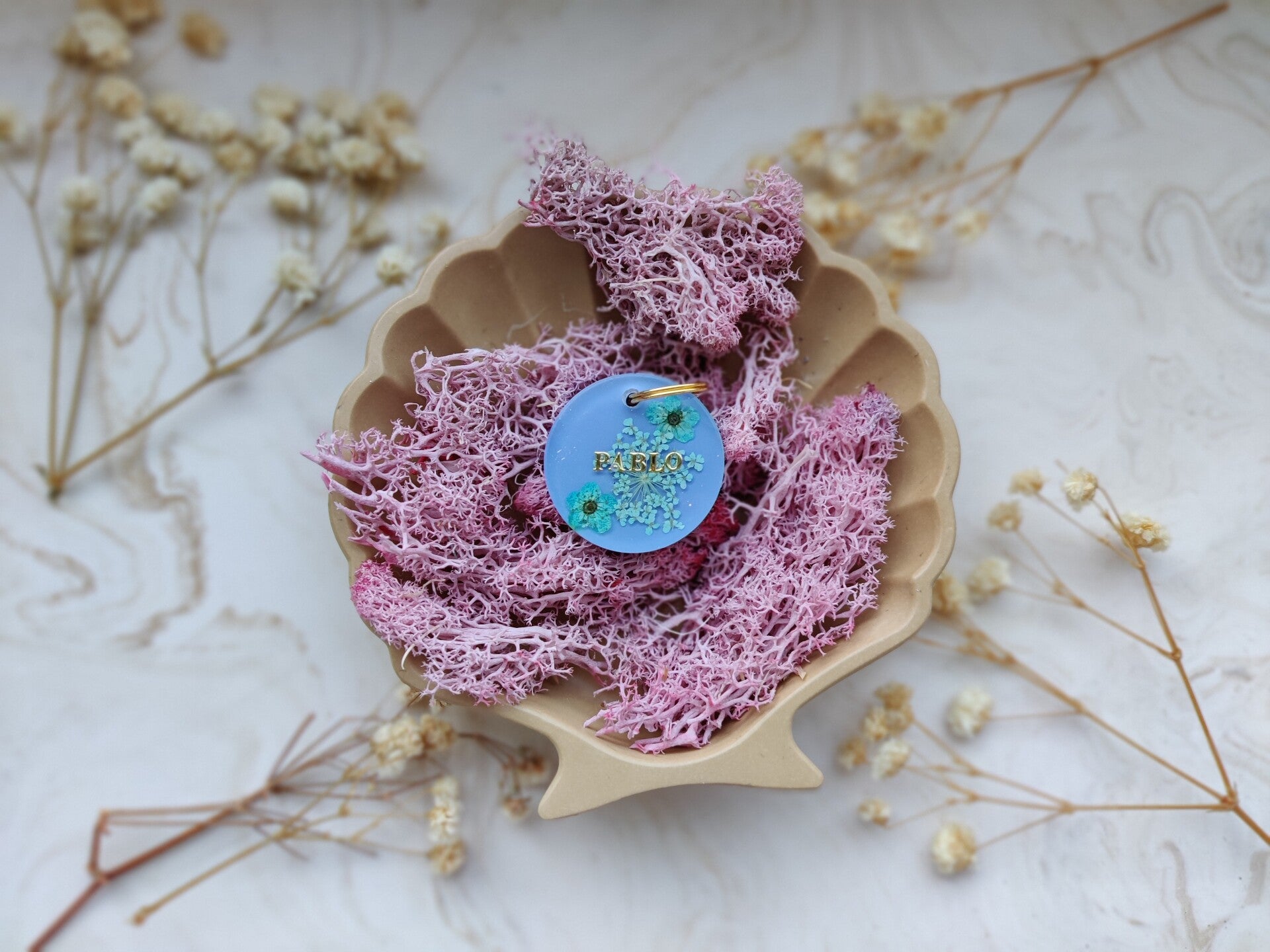 With the Personalised tag you choose your colour, shape, name, flakes, letter colour, the style of the name and if you want shadow added or not. The flakes are optional. Phone number can be added on the back.