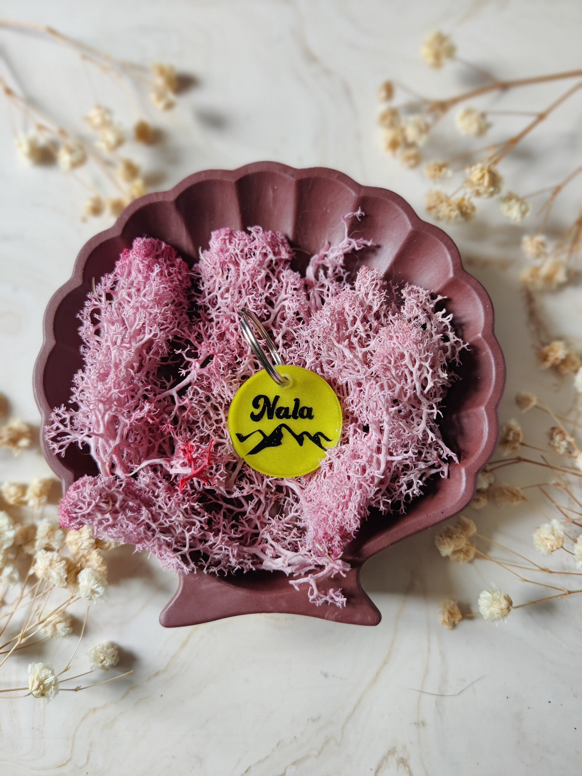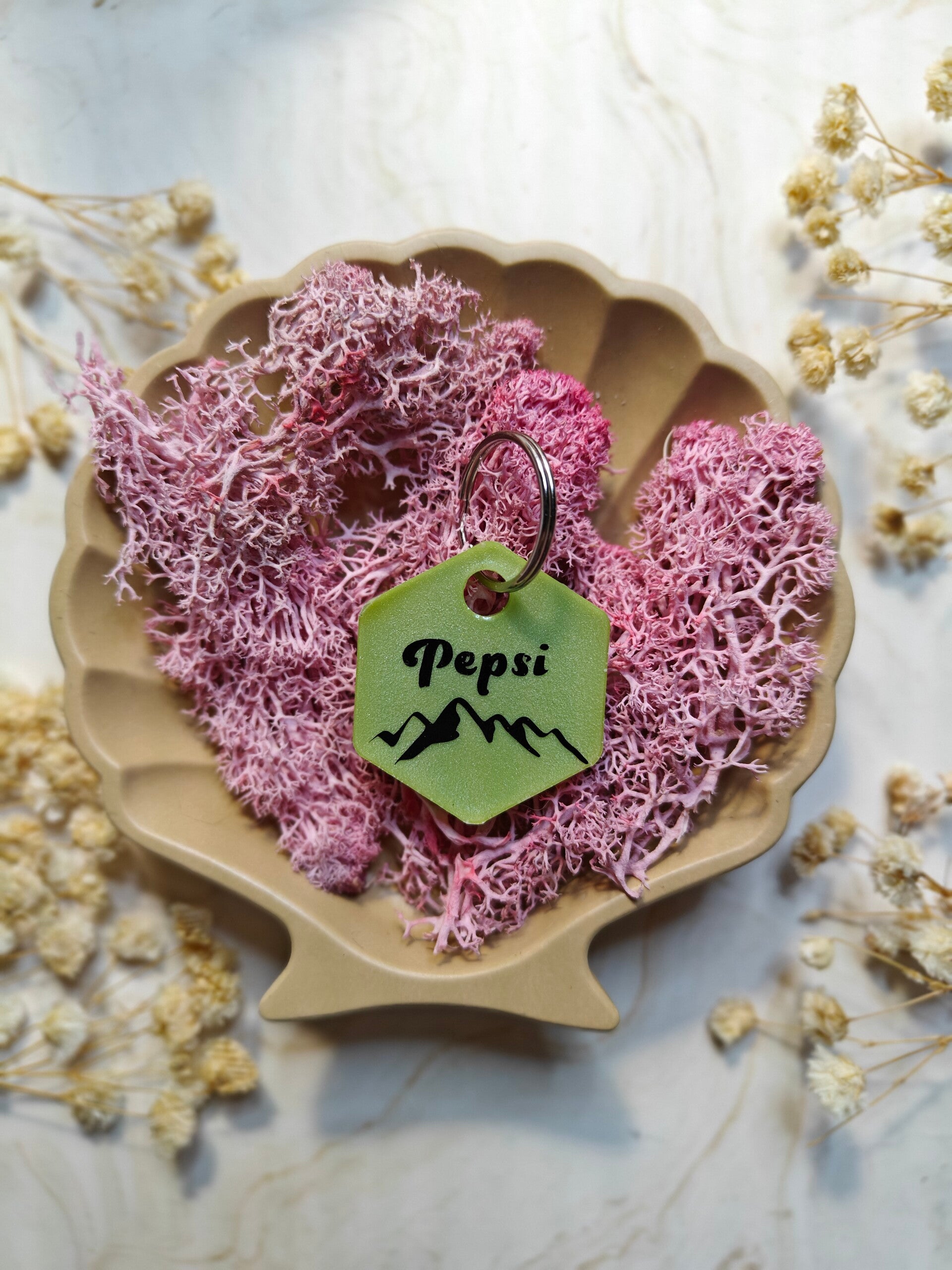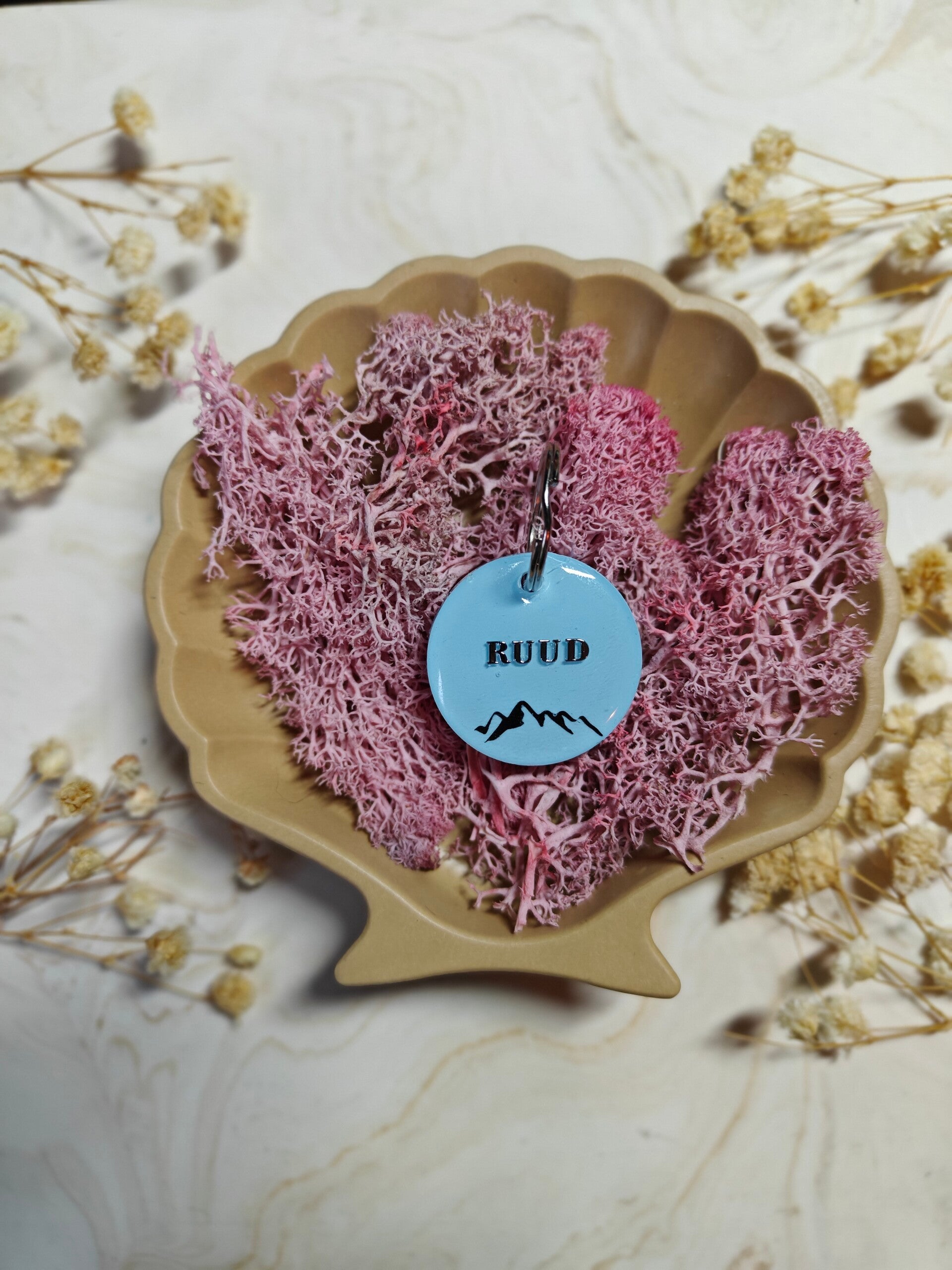 With the Mountain tag you choose your colour, shape, name, name style, if you want a shadow or not and letter colour. Phone number can be on the back. This tag is perfect for the dogs who love to go into the mountains or perfect for families who like to hike.